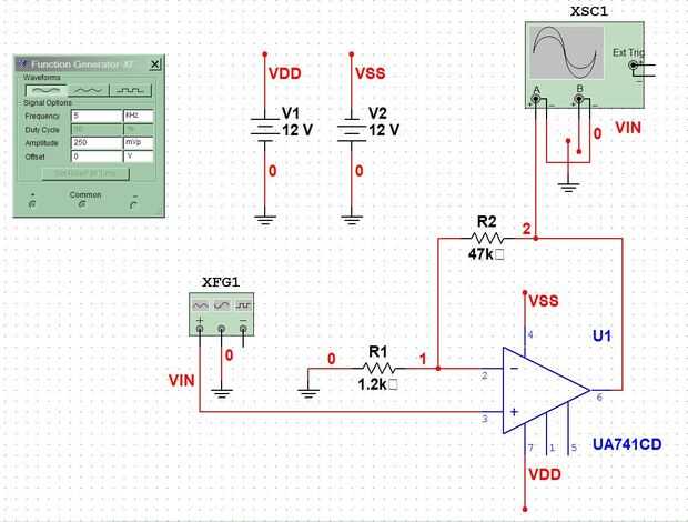 Los circuitos acepta como entrada una pequeña señal y da la señal amplificada (con la misma frecuencia y misma polaridad del original) en la salida. La ganancia está controlada por las dos resistencias R1 y R2, por esta simple ley: