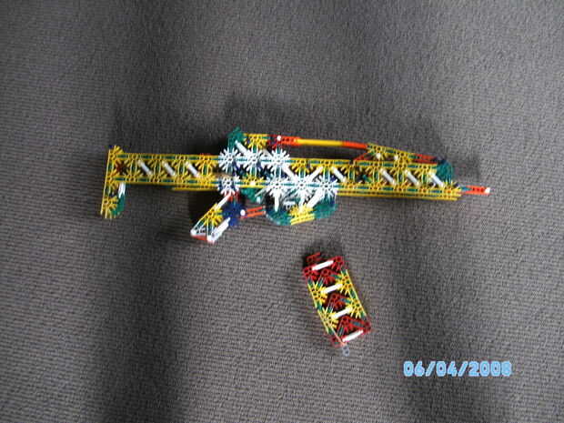This is my RMDSS v1 (Removable Mag Dual-Shot Shotgun). Dispara dos balas (a lo largo del lado, no encima de la otra) al mismo tiempo, y tiene un compartimiento extraíble que contiene 18 rondas (9 tiros), que son las barras verdes conectadas a un gris