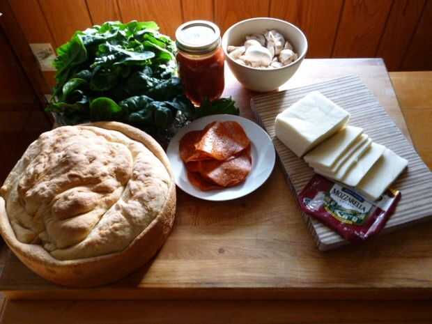 1 o 2 libra redonda de pan 1/16 de pulgada rodajas de mozzarella Trozos de tomate con hierbas Espinaca Baby Pepperoni en rodajas En cuartos los champiñones frescos