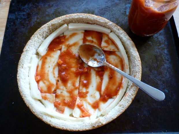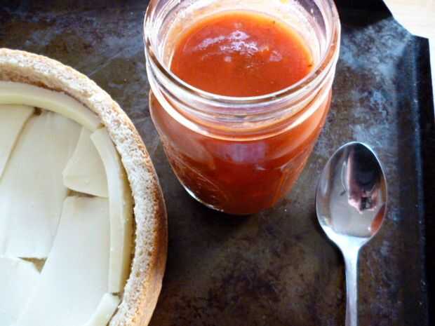 Aplique una capa delgada de la salsa de tomate sobre el queso.  He conservado en salsa de la huerta; pero la salsa de su tienda favorita es perfecta para este plato.