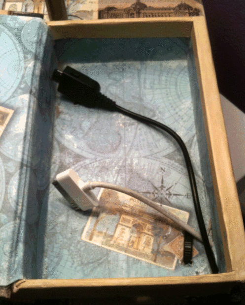 Agregar la sombra y hecho. Tenga en cuenta que utilizamos el libro más pequeño para guardar un teléfono o un iPod para cargar. Corrí los cables del cargador a través de la caja más pequeña para que no se ven.