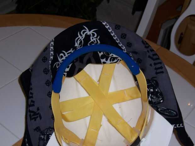 Poner el pañuelo doblado en su casco.  Deslice el extremo más largo entre la concha y suspensión frente a los tacos de frente dos accesorio.