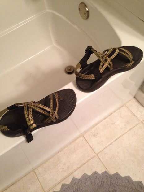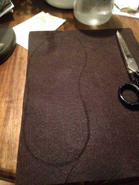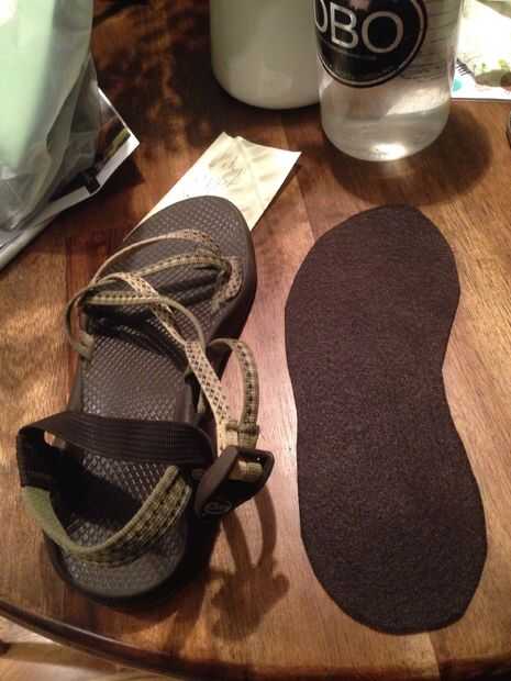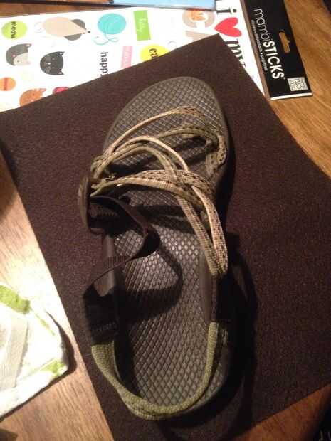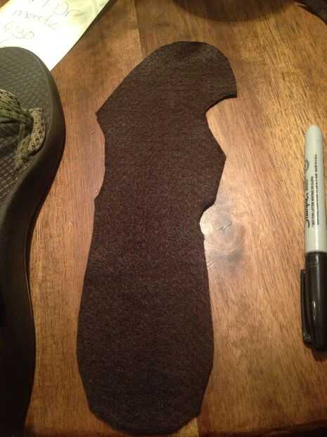 Es un poco difícil de explicar lo que hice para hacer el ajuste de fieltro en mi zapato. Empecé con un zapato recién fregado, colocado sobre el fieltro y trazó el contorno de mi zapato sobre el fieltro. Cortar el patrón hacia fuera y ponerlo en mi zapato a ver qué tan bien se. En Resumen, no cabe bien. Cubrió la correa del dedo del pie en mis Chacos, y fue sobre los bordes en algunos lugares. Necesita algunos ajustes. Usé el rotulador para marcar donde el fieltro necesario para ser cortada lejos. CINCO intentos más tarde conseguí el fieltro para encajar perfectamente en la pieza de calzado. Ensayo y error, mis amigos. Ensayo y error.