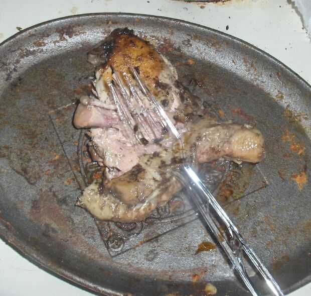 Ahora para el pollo Jerk, que era super tierno via larga cocción sumergido mediante el 'método salsera' como yo lo llamo. Tenga en cuenta lo que la pierna aplastada con un empuje de la horquilla de plástico.