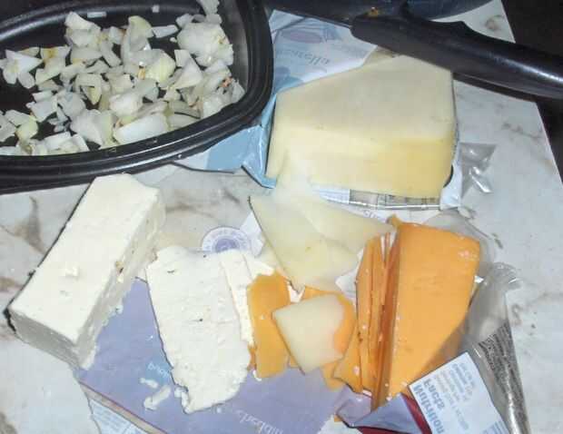 A continuación añadí la primera capa de queso. Lo fui con este diseño de capas con la esperanza de todos los mantendría juntos para la inmersión, que parecía funcionar bien. Aviso que seguí los 3 quesos (Cheddar, Feta y Mozzarella) agrupados por lo que cada bocado ser alimentado por un queso único. Me ha gustado este resultado mejor que el todo rallado y mezcla de arreglos de discos que he estado haciendo últimamente, y oh my, el queso Feta era increíblemente abrumador.