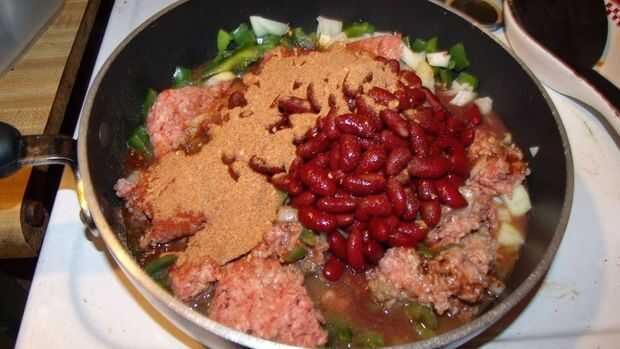 picar el pimiento y la cebolla y conseguirlos en una sartén, agregar en su carne picada, condimentos y lata de frijoles escurridos, cocinar, cubierto, en el medio, revolviendo ocasionalmente, hasta que la carne ha perdido su color de rosa entonces hervir durante 3 minutos, reducir el calor y cocinar a fuego lento hasta que la mayoría de los jugos ha sido absorbida. Apartar y dejar enfriar ligeramente y añadir el queso rallado.