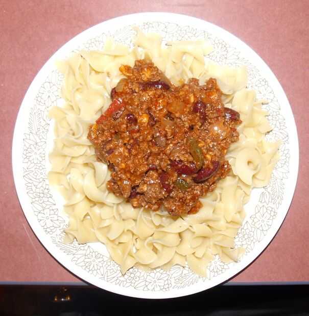 no nacho 2 es exactamente la misma mezcla de la carne, pero actúa más como una salsa cuando se coloca sobre fideos de huevo, una cucharada de crema agria fue agregada después de mi pic...