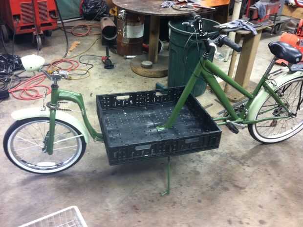 Tuve en mi posesión plegables cajas para transportar alcachofas. Estos por $1 me en una venta de garaje y pensé que podría utilizar para almacenamiento de información de cama de zapatos. En su lugar convertiría en mi cesta de la bici "temporal". Tomé dos de ellos y cortar uno de los lados largos de cada uno. Luego equipadas les juntos, corte más según sea necesario para hacer mi cesta. Los pernos de U les llevó a cabo a la estructura de soporte y correa de calentador de agua se utilizó para unir los lados. Presto! cesta de inmediata y los lados todavía podrían plegar para hacer un plano.