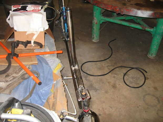 Primer paso fue la bañera de "snorkel" en las motos principal tubo de dirección de soldadura. Después de retirar las tazas del rodamiento se obtiene una pieza cerca de 2 pies largo simplemente se desliza sobre el tubo de dirección. Corte para que se desliza justo hasta donde la parte superior del tubo se conecta y soldadura en.