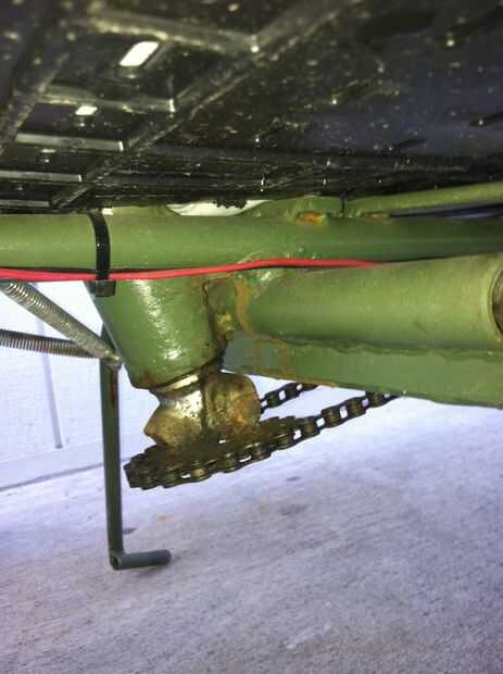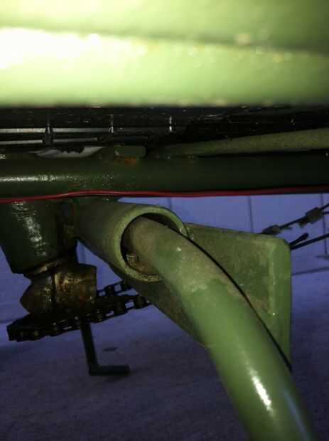 En la segunda foto se puede ver mi resorte de retorno. Sólo se realiza con tornillos a mi canasta y lazos alrededor de la pata de la pata de apoyo. La primavera es sólo un resorte de la puerta de la pantalla barata.