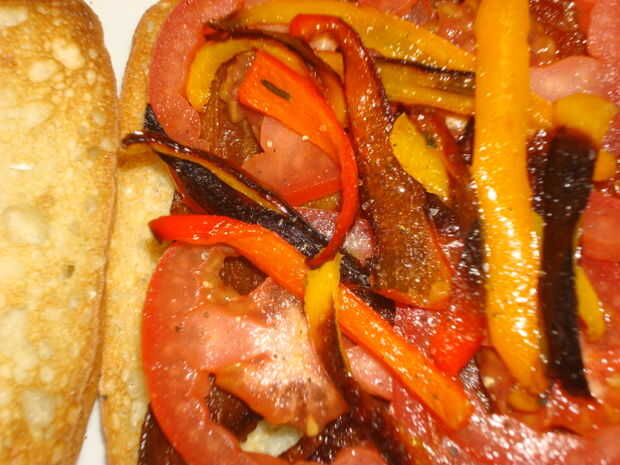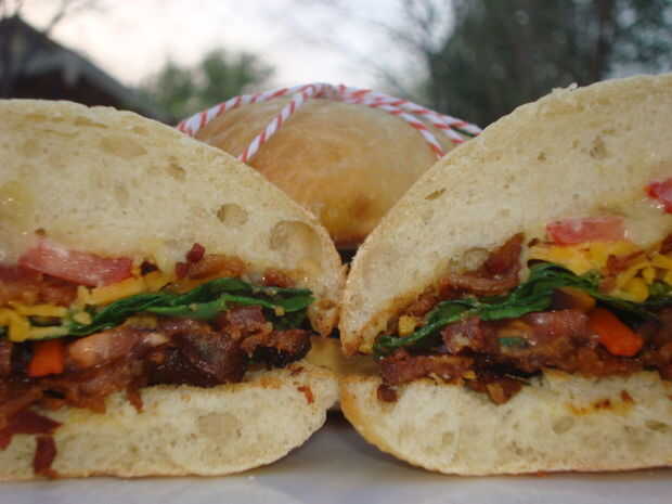 Let the build begin! Capas el tocino, tomates, pimientos, queso, espinaca y repitió un par de capas más! Esparza la mezcla de ajo y mayonesa sobre pan. El sándwich de la cubierta y atar con cordeles de panaderos!