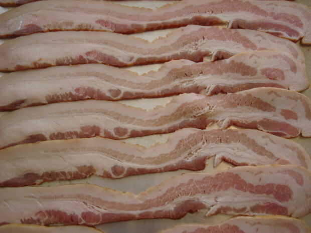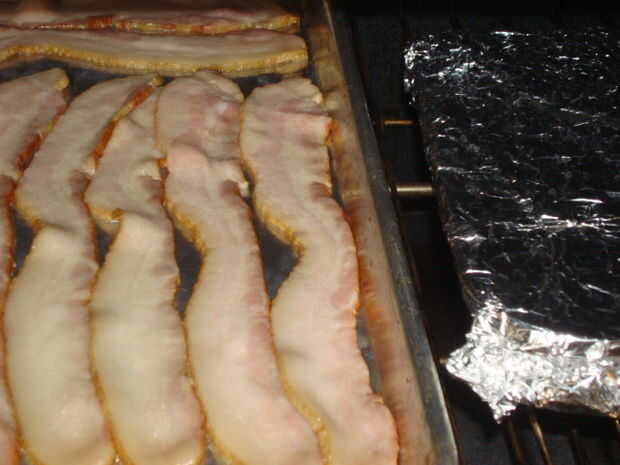 Coloque el ajo y el tocino en el horno a 325 - 350 grados F durante unos 30 minutos o hasta que se hace el tocino y el ajo es suave.
