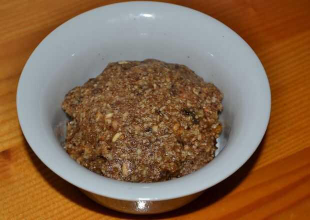 la pasta base para las barras de energía serán tuercas y miel: picar suficientes nueces para cuántas barras desea hacer (yo usé avellanas) en el procesador de alimentos y agregar algo de miel (es más fácil si calientan un poco la miel), hasta pegajoso. Puede ser aproximadamente 1/3 de miel y 2/3 de la picada de frutos secos o nueces y muesli.