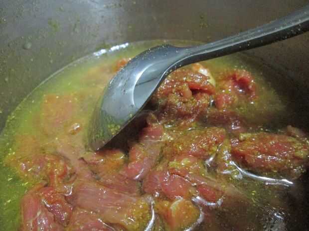 En una pequeña cazuela, mezclar la carne de res con sal, cúrcuma, cilantro en polvo, ajo en polvo, masala del garam y 2 cucharadas de aceite de oliva.