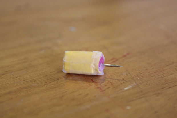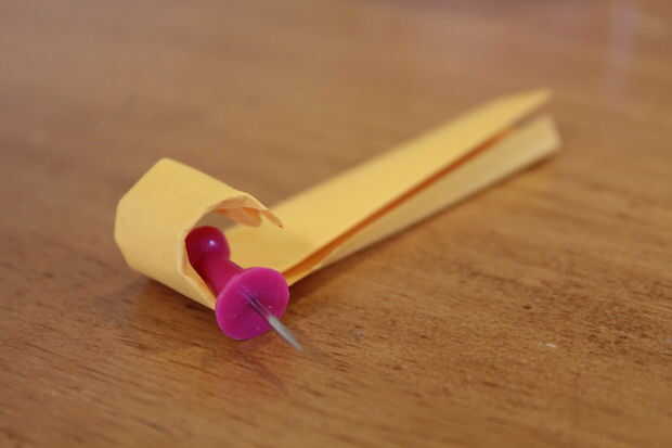 Cómo modificar las tachuelas para que encajan mejor en el tirador. En primer lugar, tomar la pieza de la papel y dóblalo a aproximadamente la misma altura que la tachuela BASE. Corta alrededor de una pulgada de papel doblado, después Envuelva la no 1 pulgada alrededor de la tachuela de BASE. Únalos con cinta adhesiva todo eso. Luego para mayor seguridad, tome un pedazo de cinta y perfore a través del punto de tachuela y envuelva la cinta alrededor de los bordes de la tachuela.