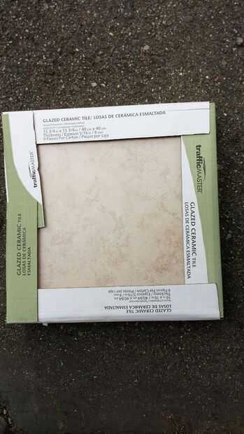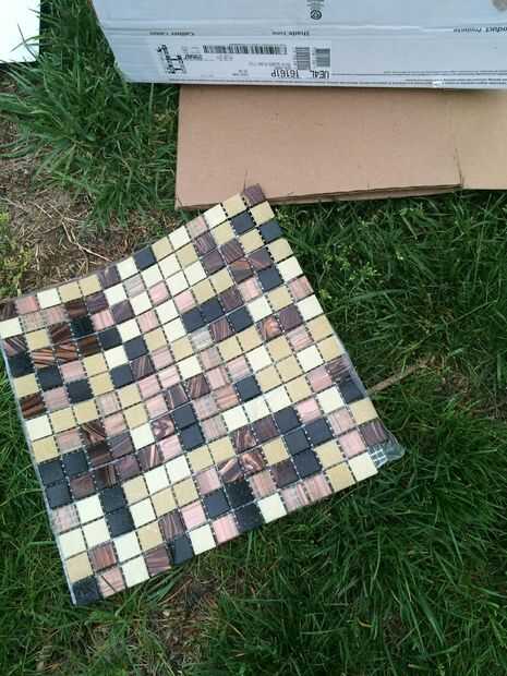 He comprado los azulejos más baratos que pude encontrar en la ferretería. Estos fueron casi 16" cuadrado baldosas y la caja de lugar suficiente para 16 pies cuadrados de espacio de piso. También compré 2 hojas de vidrio pequeño azulejo esteras para usar como bandas de borde.
