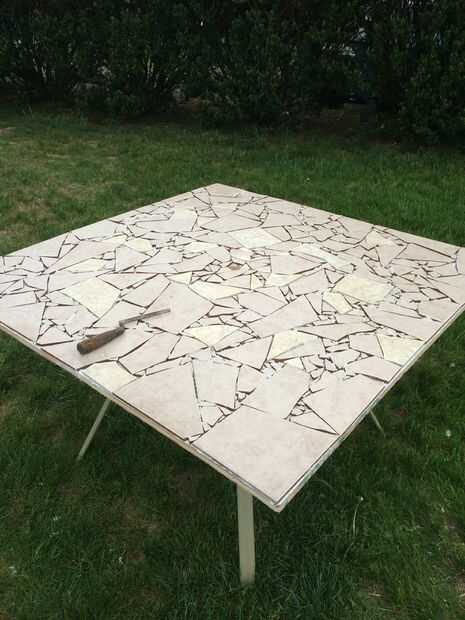 Podría han utilizado los azulejos completos y cubre la mesa. Hubiera tenido que afeitarse alrededor de una pulgada de la longitud y la anchura de la madera contrachapada, pero yo pude han hecho trabajar. También hubiera tenido que perforar un agujero en el centro de la media teja con un poco de cerámica, que tengo, pero no es lo suficientemente grande para el poste de la sombrilla. Tuve una opción de moler el agujero con una Dremel bit para 5 o 6 días (exagerando), alquilar una sierra mojada, o crear un diseño de mosaico sobre la mesa. Opté por el mosaico porque parecía lo más divertido.
