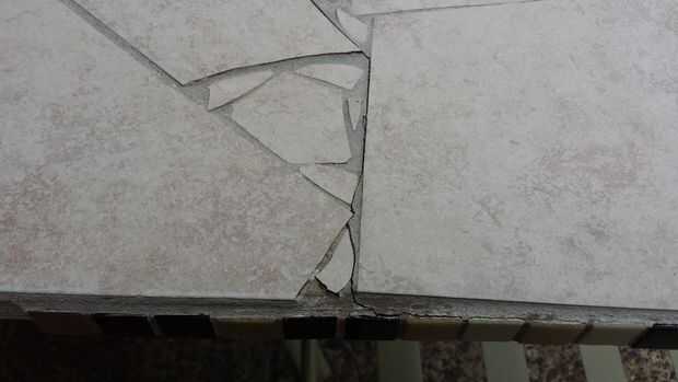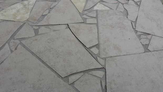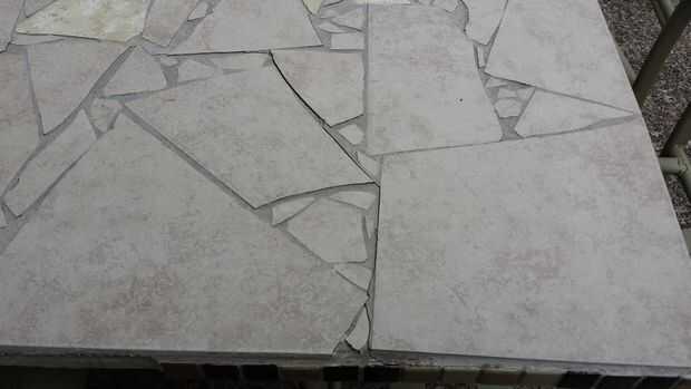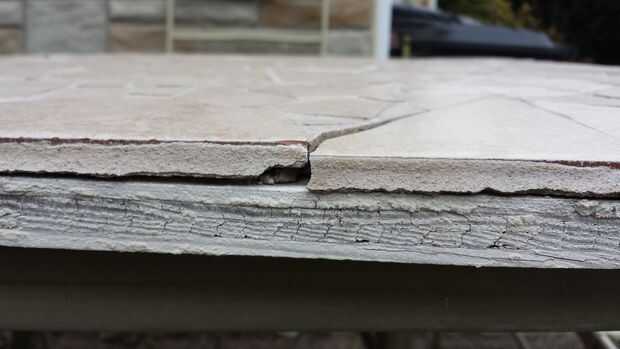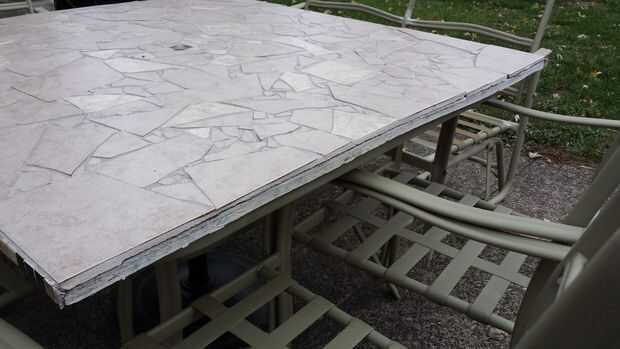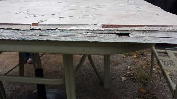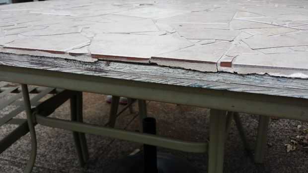 Estas fotos fueron tomadas después de la mesa se sentaron fuera en los elementos para las temporadas de verano y otoño. La lluvia causada grietas que se abren en la boquilla, el mortero de capa delgada para separar de la base y los bordes de los azulejos se caiga completamente.