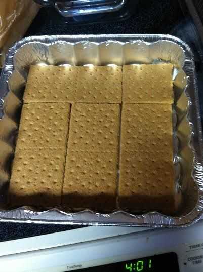 esto no es una forma fácil hornear receta para un día caluroso de verano.Todo lo que necesitas es:Un paquete de galletas4 malvaviscos gigantesPudín de Chocolate instantáneoChips de chocolatePaso 1: corteza de galleta De la corteza sólo tendrá 3 bombo
