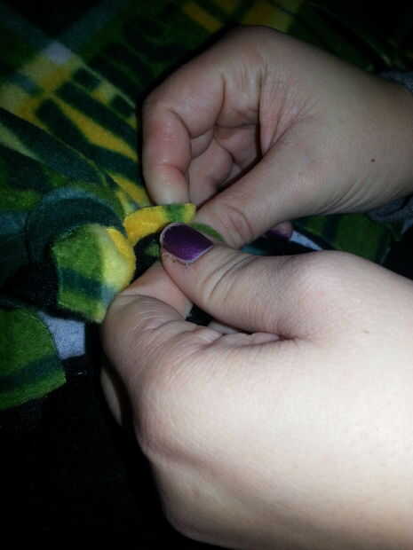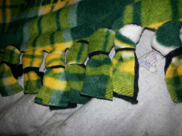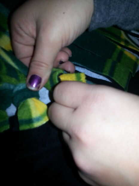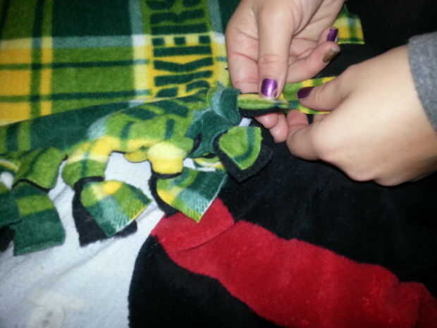 Una vez tu se tu franjas cortado comienzo los atando. La tela del paño grueso y suave se estira cuando ATA. Asegúrese de que las telas se alinean cuando se les atan. Este es el lazo del globo. Encima creo que esta parte al igual que atar un globo de agua. Tome dos dedos y el tejido alrededor de ellos y tire que los dos extremos juntos lanzaron el rap. Dependiendo de si la izquierda o la derecha entregado podría decidir en que forma se siente más cómoda haciendo los amarres. Cuando haces los lazos lazo cada tira de la misma para que la tela se sienta bien en la parte superior del lazo para que quede hacia arriba. Esto no es crucial pero hace que se vea mucho más bonito cuando sus vínculos se enfrentan a la misma y plano.