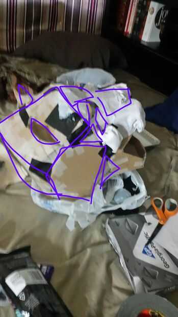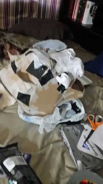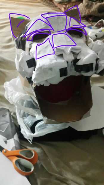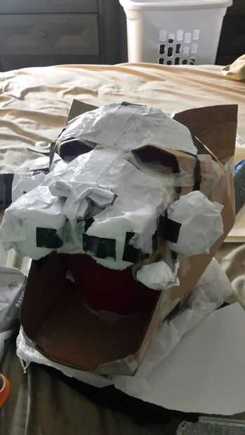 Después de hacer la boca crea la nariz. El puente de la nariz, la cavidad del ojo, los lados de la cara. la parte posterior de la cabeza. la parte superior de la cabeza. las orejas. Esto se hace con cinta de regular, 1 pequeño 14 x 14 x 14 caja de cartón (yo usé la mitad de la caja) y el uso de corte symettrical 2 picies de cartón para hacer ambos lados de la cara tienen el mismo aspecto. (Principalmente utilicé picies de forma rectangular grande/diamante). La parte posterior de la cabeza y mandíbula zona utiliza cinta pato para mantenerlo seguro. Este paso contiene algunas imágenes debido a la contracción del tiempo.