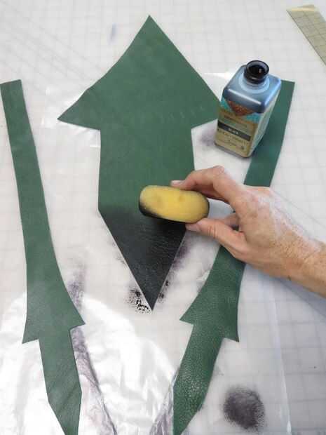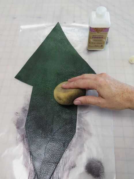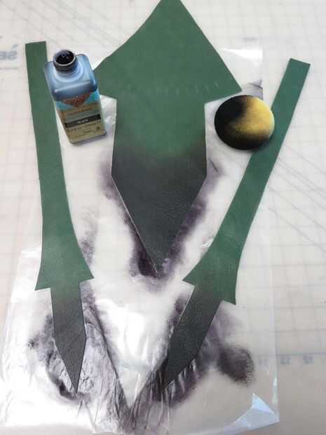 Para crear el negro efecto verde ombre en mi franja, coloco mi triángulos del sujetador y tirantes en un pedazo de papel de cera y esponja los extremos inferiores de las zonas marginales con waterstain negro, descolorarse hacia fuera en el verde.