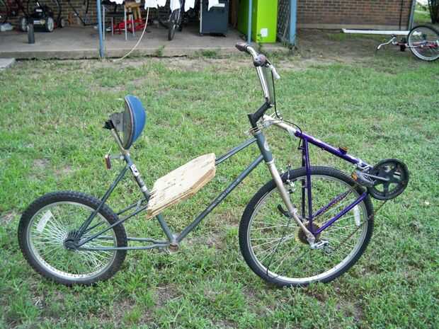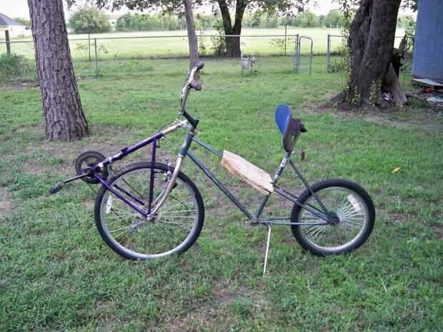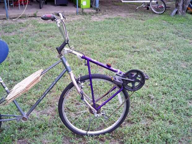 Pronto descubrí, que para hacerlo de esta manera usted termina con una configuración de buey de rueda delantera coche rueda delantera. Menos de ideal pero si esto fuera ideal tendría un funcionamiento soldador para que punto realmente es discutible. Construí esta en una tarde con la única intención de tener una moto funky a montar así que pido disculpas por la falta de fotos de la construcción. Yo no iba a hacer un instructable pero Lucas sobre en makezine.com me pidieron, así que esto es un breve resumen de lo que tomó para construir mi reclinada.