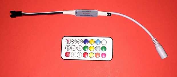 El primero fue un buen controlador de WS2811 compacto con un mando a distancia IR. Esto era muy fácil y veía muy bien. Tiene patrones de 64, y algunos patrones funcionan mejor que otros. Este controlador fue muy fácil conectar seno tenía en los filamentos de los conectores de tres hilos ya.