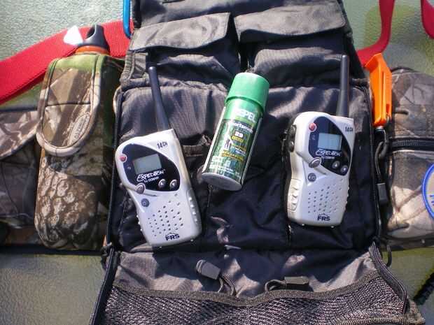 Los bolsillos siguiente contienen aerosol de insecto y un par de radios portátiles de FRS. Radios no son buenos sin pilas (ni son linternas) así que asegúrese de llevar repuestos. También colocar una cinta de corte fino plástico de un blister entre las pilas y conector de metal en cada radio. Evita que accidentalmente dejando la radio encendida, y evita que las pilas bajando debido a un consumo mínimo que podría ser parte de los circuitos de radio. Simplemente tire de ella hacia fuera (y salvo) cuando es necesario utilizar las radios.