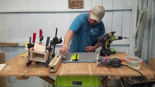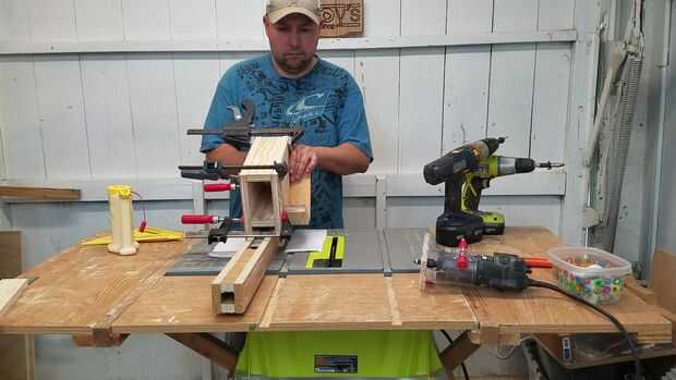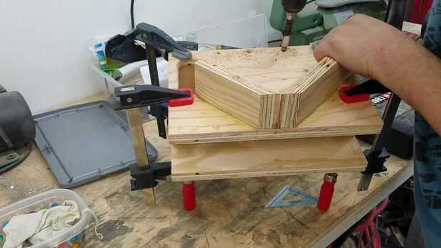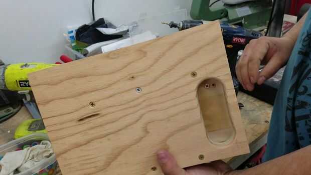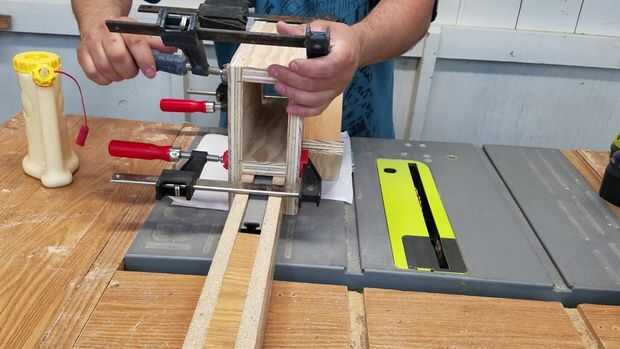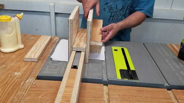 Para impedir que la plantilla se arrastra por la superficie de la Sierra de mesa, coloqué un par de pedazos de papel en los paneles laterales. He aplicado pegamento y fijada por la Asamblea. He quitado la Asamblea afianzada con abrazadera y póngala a un lado. Quité todos pegamento exprimir hacia fuera con un paño húmedo. Con la Asamblea todavía afianzada con abrazadera juntos, me pre perforados y condujo en varios tornillos. Nota: Asegúrese de que las asas están enfrente de uno a