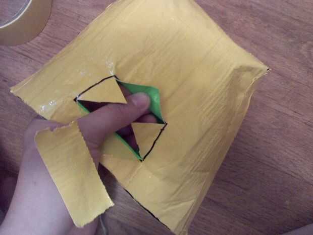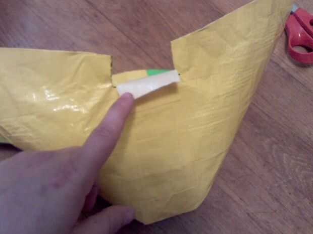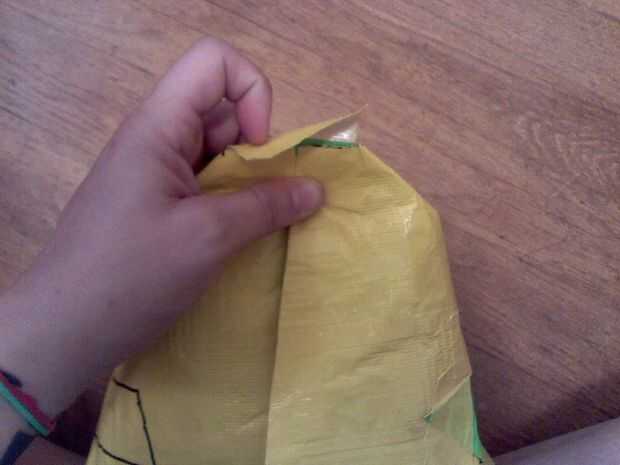 · Ahora gire su bolso adentro hacia fuera y correr un pedazo de cinta a cada lado dejando un poco más sobre las esquinas, el extra de la cinta hacia abajo sobre las esquinas
