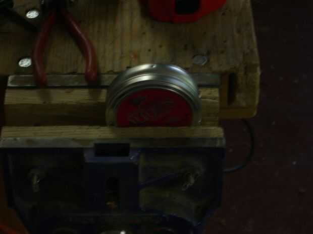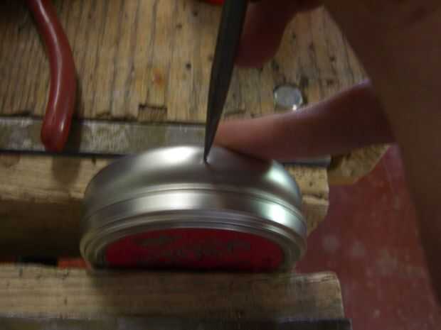 Para hacerle este punzón justo (poke lo con algo afilado) en la que desea el agujero, poner la lata en un vicio, luego use las mechas adecuadas para la parte que vas a poner allí.