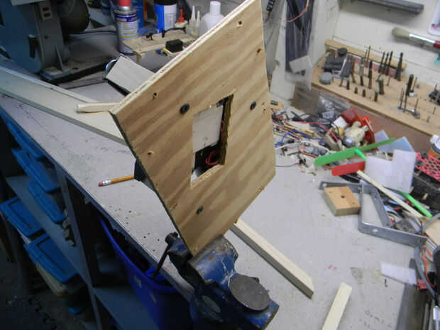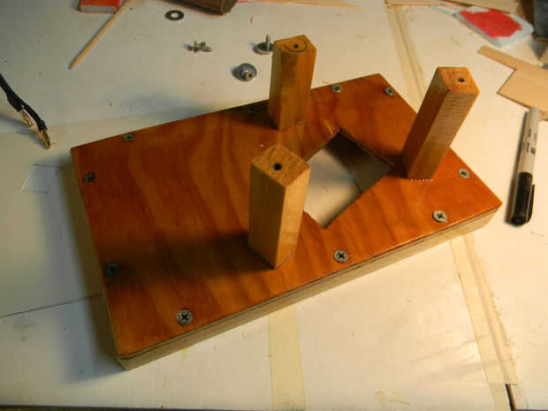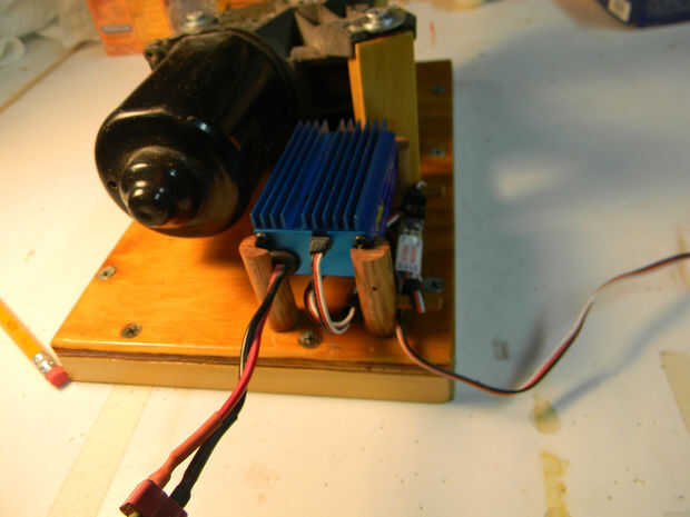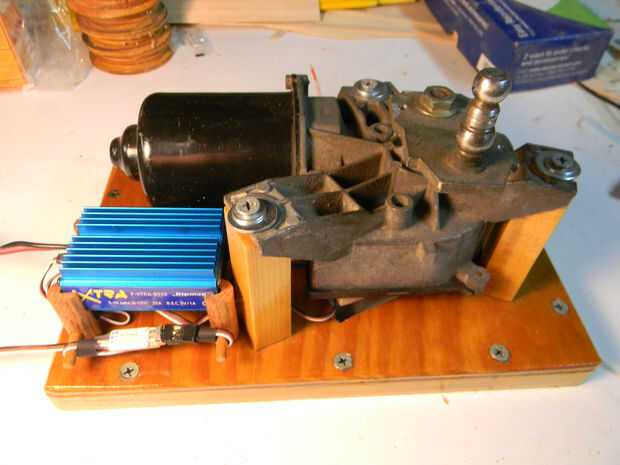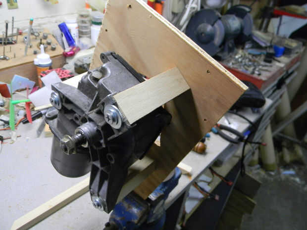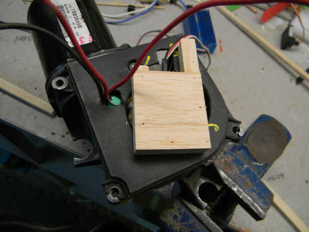 Hice una pequeña cubierta para el probador de servos mantener en la alineación y cortar la tapa de plástico trasera de limpiador para borrar el probador servo. Se reinserta el clip "E" para sostener el engranaje en. Es atornillar la tapa de plástico trasera y tapa del probador servo se atornilla en. Sentí que necesitaba un soporte para demostrar el poder del servo, así que hice uno para montar el limpiaparabrisas. Le di una capa de barniz del mástil para estabilizar la madera contrachapada. Corté un agujero en la parte inferior para acceder el probador servo si necesito y para hacer más fácil conectar.