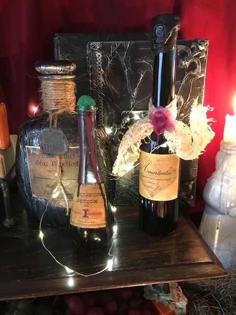La botella del amor — es la botella de vinagre negro alto. La etiqueta fue afligida y adjunto como los dos primeros. Un poco de encaje fue agregado y pegamento en su lugar. Un sello caliente azul/lápiz fue hecho como la botella de veritaserum y fue utilizado un sello del corazón. La cera como la tapa con el relieve #9 fue hecha con una combinación de uno negro y uno gris tiza a 6 palos de pegamento mini. Estos fueron derretidos en una lata. Una vez derretido la parte superior fue sumergida en la "cera" y estampada con un #9 antes de que era genial.