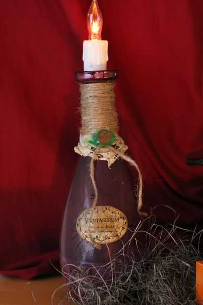 Por las fotos he añadido una bombilla parpadeante de JoAnn telas. (Principalmente porque yo fuera de lugar la parte superior del decantador!) Después de que lo encontré he añadido Glo en la pintura oscura dentro. Una vez que estaba seco he añadido el mismo carmín quemado utilizado en la botella.