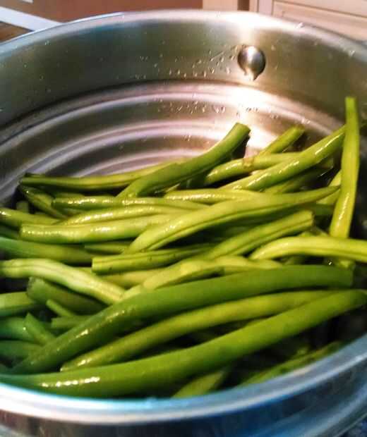 Coloque una buena cantidad de aceite de maní en olla grande (para freír) y calentar hasta aprox. 350 grados. Preparar judías verdes cortando brotes en los extremos. Luego coloque en el colador y enjuague hasta que quede limpia.