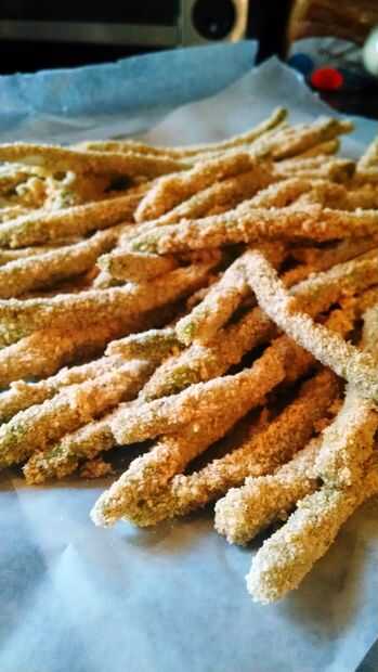 Ahora tiempo para empanar! Tomar judías verdes, sumergir en la mezcla de huevo, agitar de la mezcla de huevo exceso, entonces capa en completamente en las migas de pan y reservar sobre papel de cera hasta que esté listo para freír.