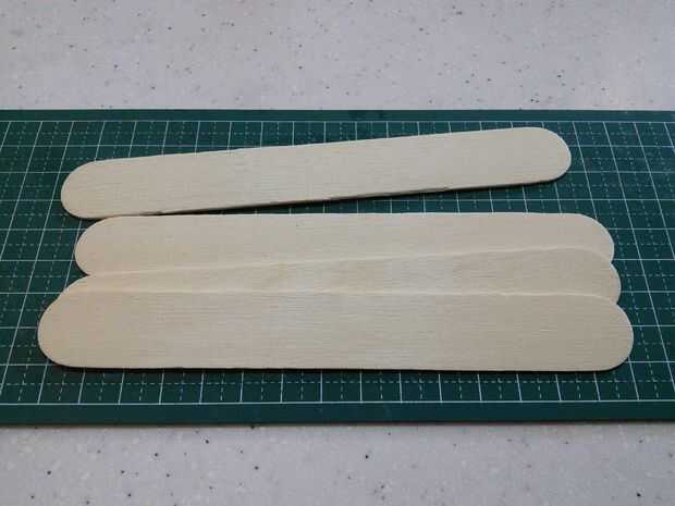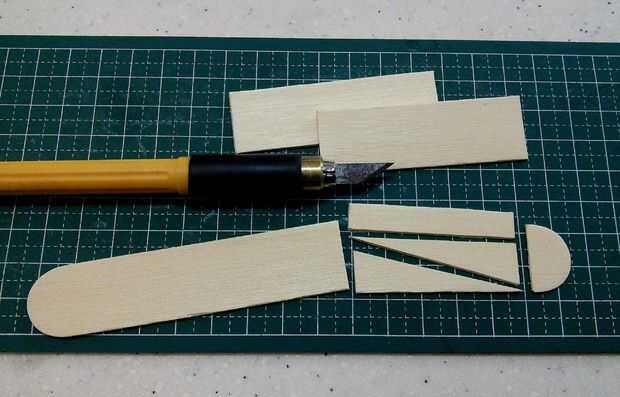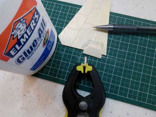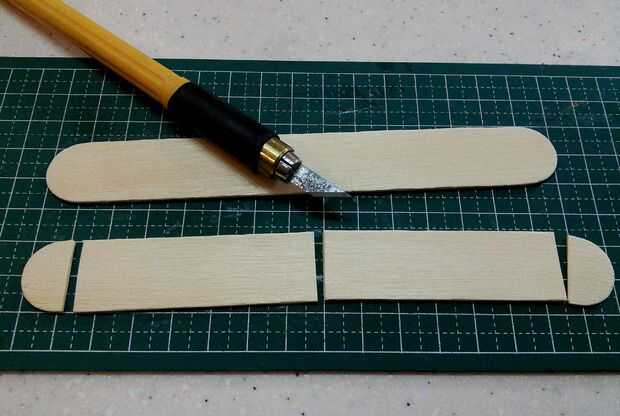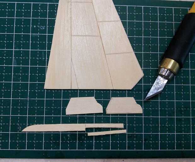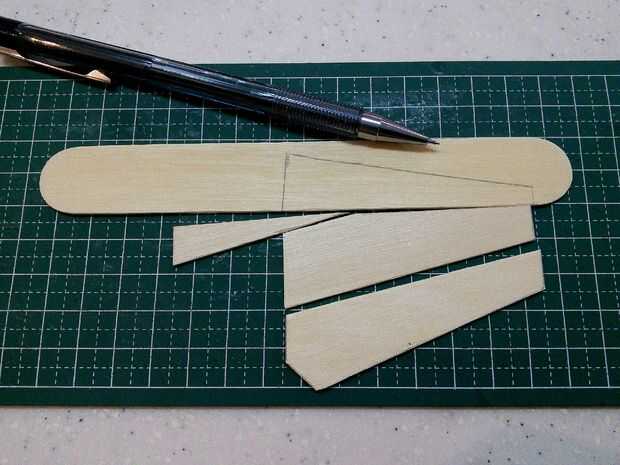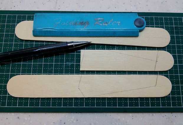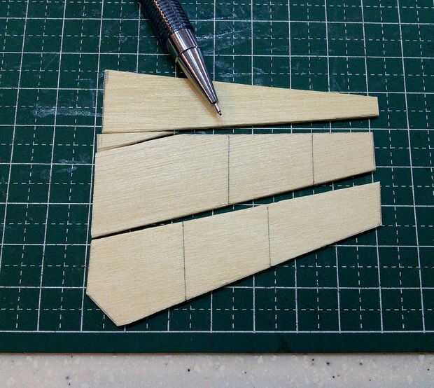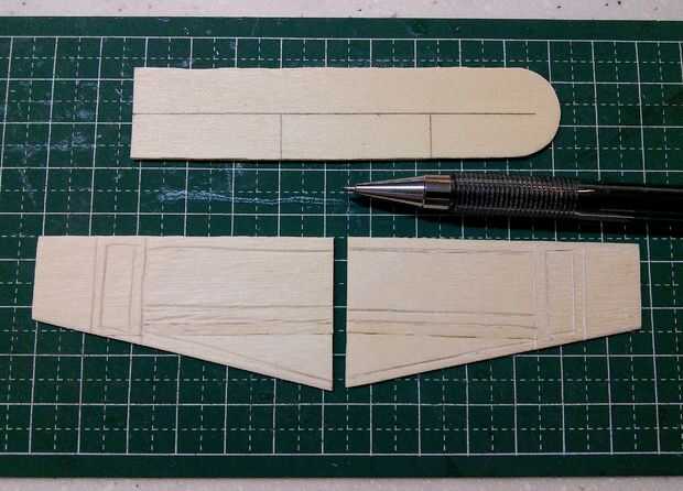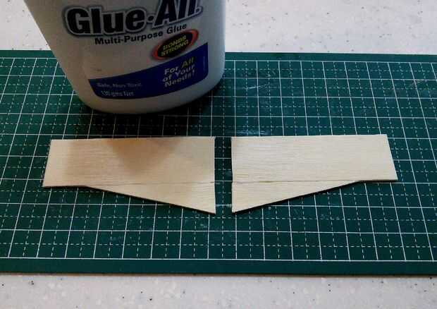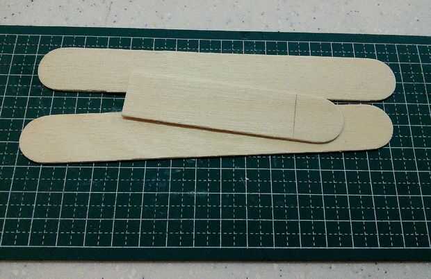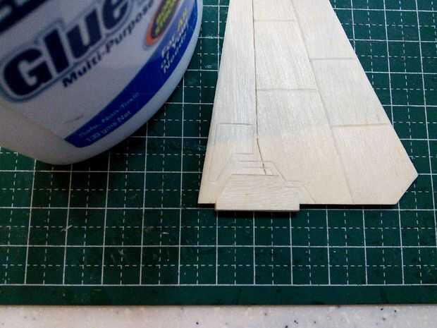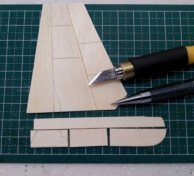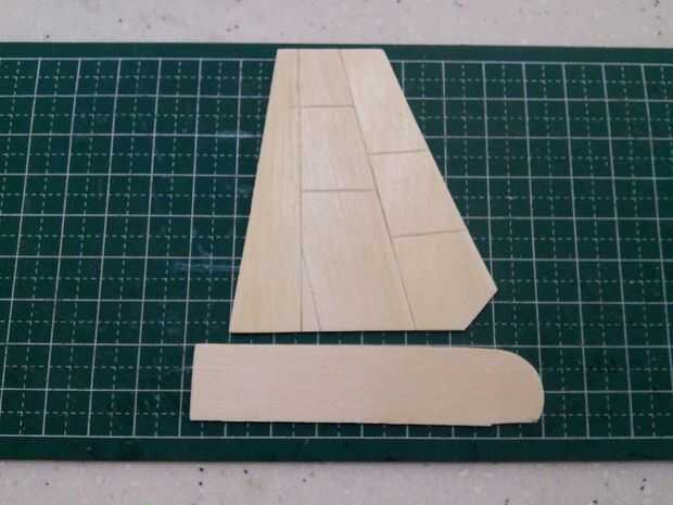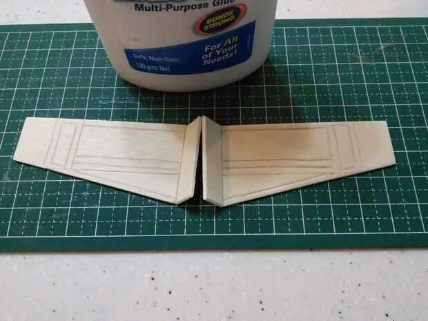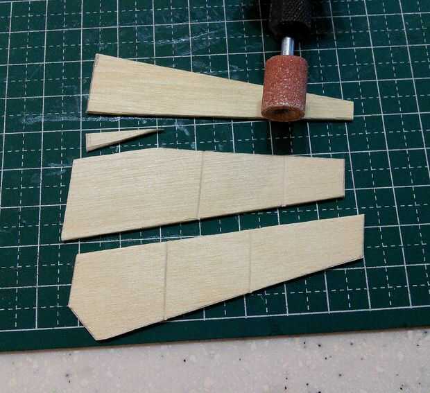 Del puerto y estribor estabilizadores fueron hechas de los misma palitos de amplio tamaño de depresor de lengua. El puerto y estribor 'alas' necesaria palitos bajalengua de tamaño de uno y una mitad. La 'mitad' debían ser rebanado diagonalmente con un cortador Olfa antes de que puede ser pegado a la mitad más grande. El borde sobrante de cada ala fue tallado fuera utilizando un accesorio lijadora grano mediano 1/2 tambor.