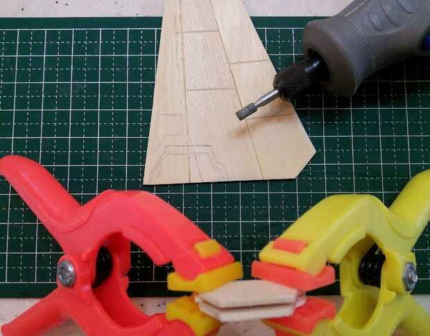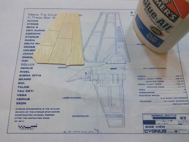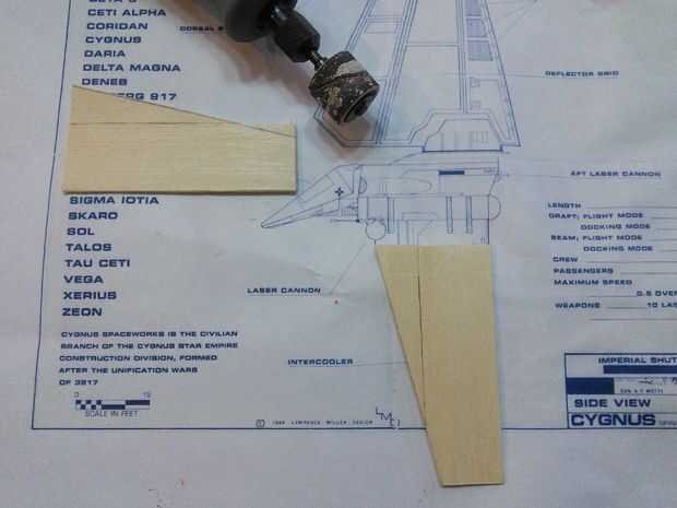 Para las enormes alas dorsales, eran necesarios no menos de tres 3 palitos de amplio tamaño de depresor de lengüeta. Cada pedazo grande se cortó con un cutter de Olfa utilizando los esquemas de theforce.net como referencia principal. Había grabado líneas a través de cada parte con un accesorio de óxido de aluminio #932 antes pegan cada parte enorme. Incluso con los palitos de amplio tamaño de depresor de lengua, he añadido aún un triángulo de chatarra para llenar la brecha entre las alas medias y finales. Cuando la Asamblea se haya secado, grabado al agua fuerte otros detalles utilizando un accesorio de Dremel #83702. Terminé las alas dorsales con un accesorio de lijadora de disco fino, asegurándose de que los bordes son rectos e incluso.