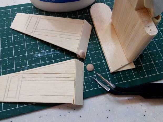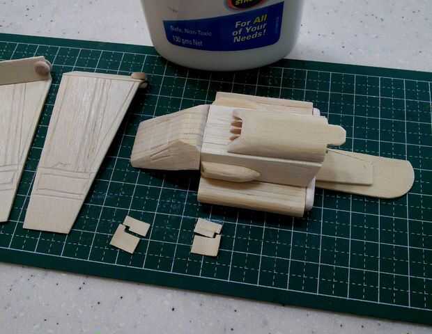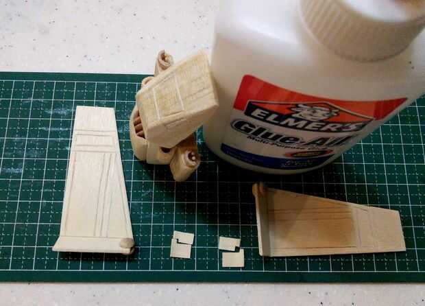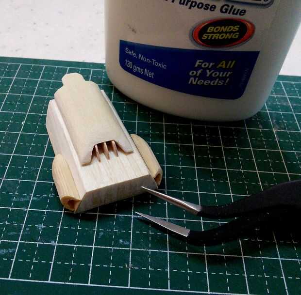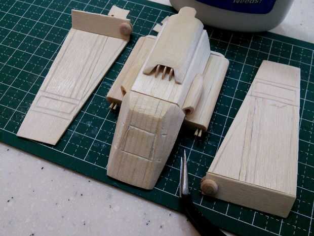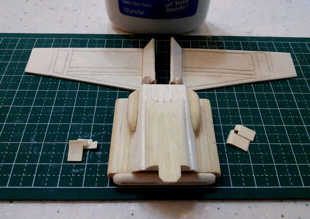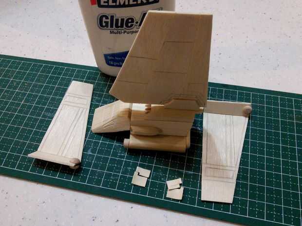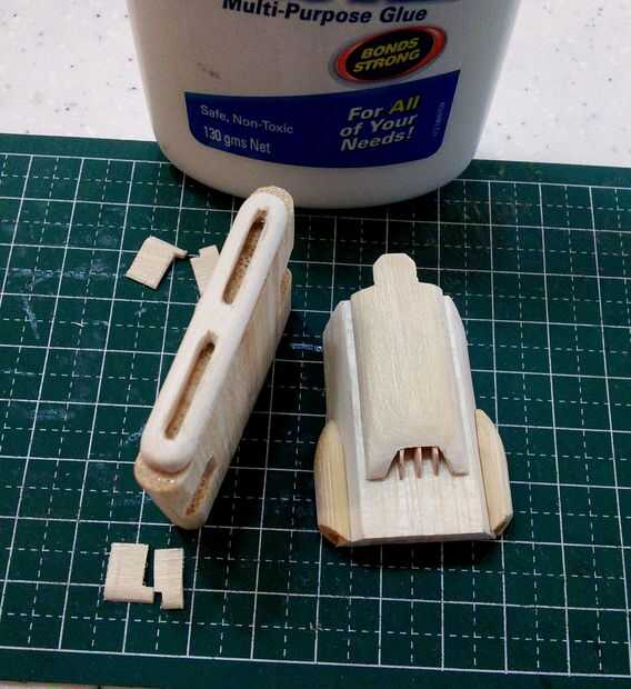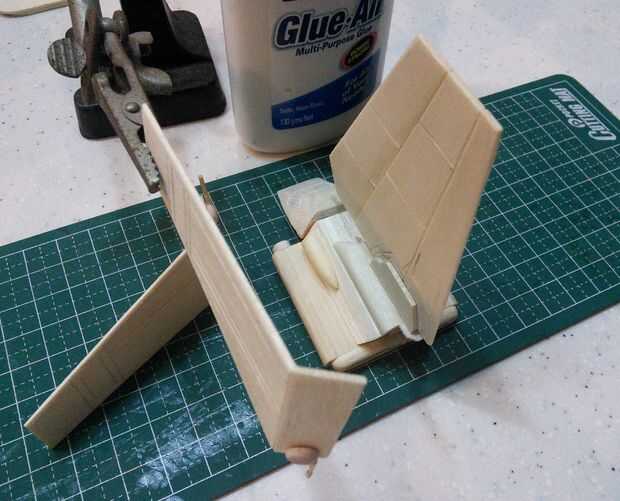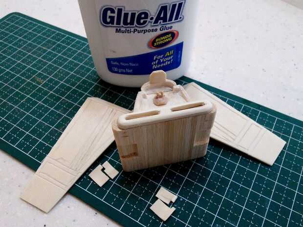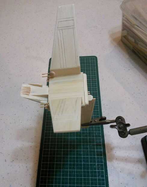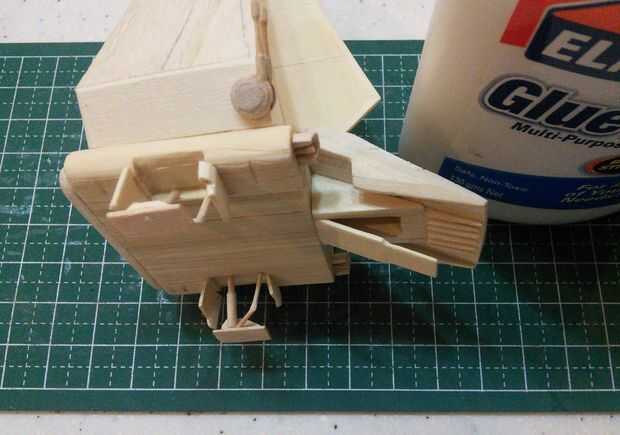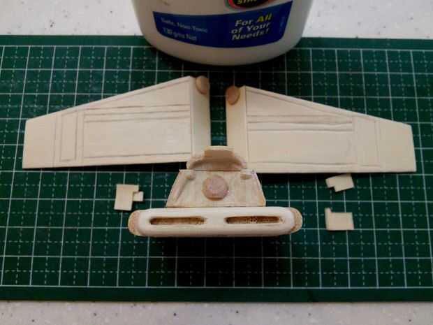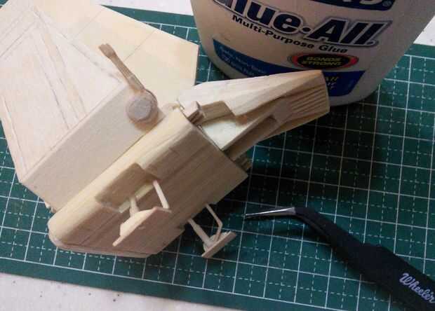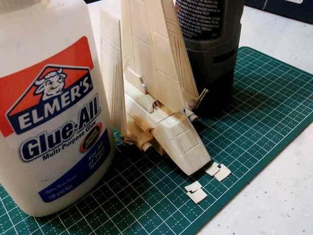 El centro de mando de la cabina estuviera pegado a la Asamblea del fuselaje terminado a continuación. Mientras seca el pegamento entre el fuselaje y la cabina, me volví mi atención al puerto y estribor 'alas'. Pegué las monturas blaster redondo en la parte delantera de ambos lados de la ala de gaviota invertida en cada uno de los puerto y estribor estabilizadores.