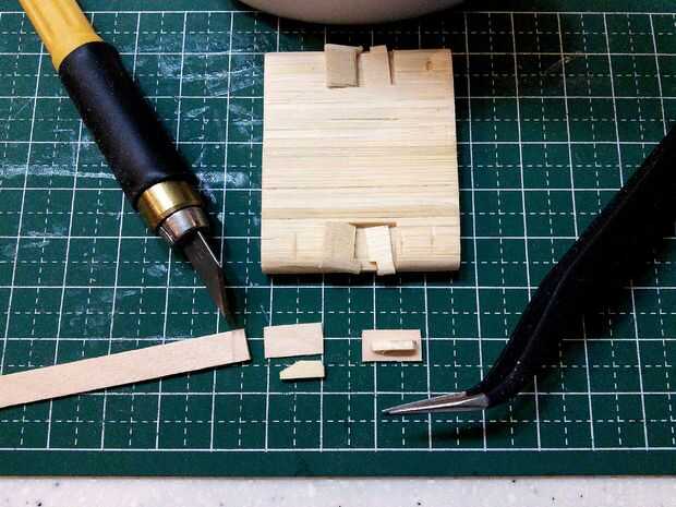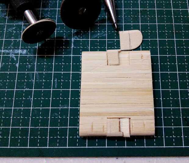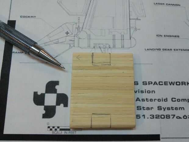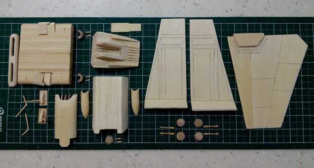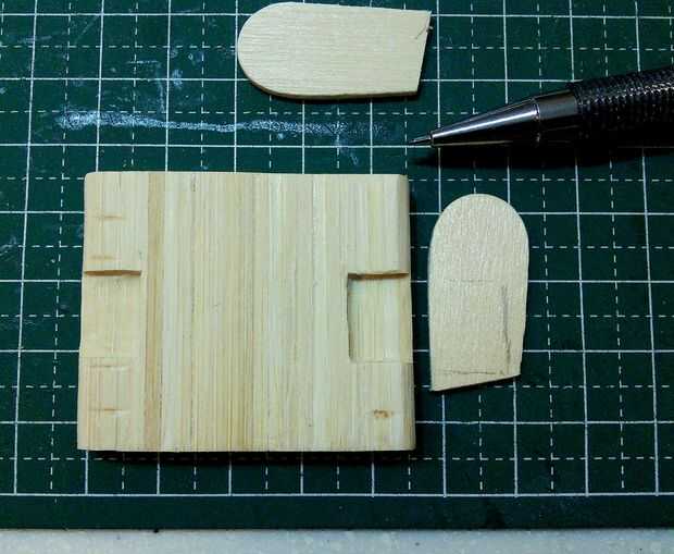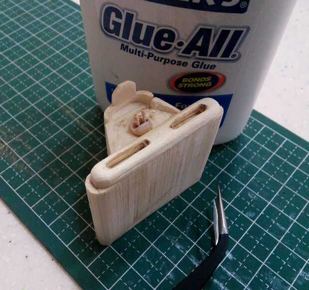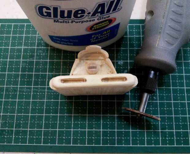 Cubre repuesto helado de madera cucharas fueron utilizadas para fabricar el tren de aterrizaje. Inicialmente fue cortada con un cutter de Olfa, tallado con un grano mediano 1/4" tambor accesorio de montaje y terminado con un accesorio de disco fino de una herramienta de la moto. Usé un disco abrasivo estándar para hacer el corte intrincado para cada mitad de la cubierta del tren de aterrizaje.