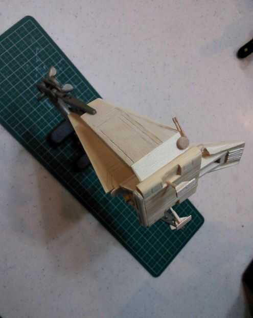A continuación, los soportes de suspensión y trenes de aterrizaje estaban pegados a la parte inferior del fuselaje inferior. Que necesitaba fabricar monturas especiales para apuntalar la lanzadera mientras la Unión de asambleas de aterrizaje con el fuselaje. En esta etapa pegué las puertas del tren de aterrizaje en el frente y el borde posterior de las cavidades del tren de aterrizaje. Por último, pegué la rampa de abordaje a la cavidad posterior inferior del centro de comando de cabina. La rampa de embarque sirve como el 'estabilizador' que mantiene el servicio de transporte por sobresalir en la parte delantera.