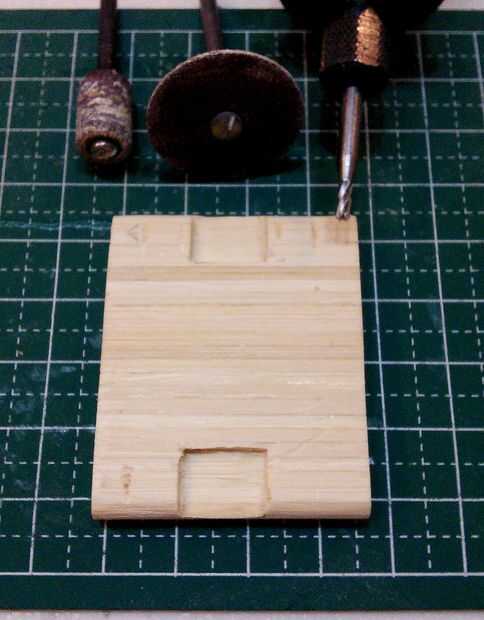 Empecé con la talla de un espacio por debajo de los lados opuestos del fuselage más bajo para los montajes del tren de aterrizaje. Un accesorio de la rueda de corte estándar fue utilizado inicialmente para hacer una ranura de guía para la cavidad del tren de aterrizaje. Un grano mediano 1/4" tambor de montaje accesorio fue utilizado para tallar hacia fuera de la cavidad del tren de aterrizaje y un cortador de alta velocidad #193 fue utilizado para terminarlo.