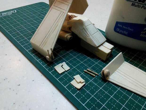 Con todas las piezas de suspensión fabricadas, la Asamblea para el fuselaje, toldo, estabilizador dorsal y blaster se monta en el puerto y estribor 'alas' eran similares a la Asamblea en la versión en modo vuelo. Estas en el lugar, pegué los blasters en una posición retraída en el puerto y estribor alas. Cuando estos se hayan secado, pegué el puerto y estribor alas a la Asamblea de fuselaje/pabellón también en la posición retraída.