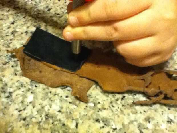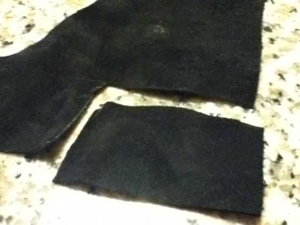 Obtener su cuero de chatarra y cortar un rectángulo de buen tiro de Honda fuera de él. Cuando termines con eso, cortar o perforar un agujero de buen tamaño (lo suficientemente grande para la banda de goma para caber a través de) en cada lado.