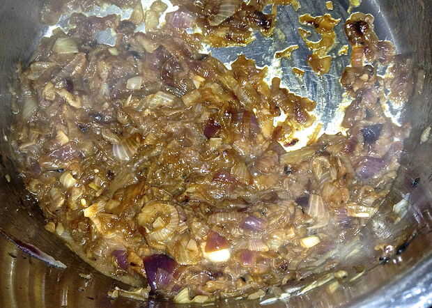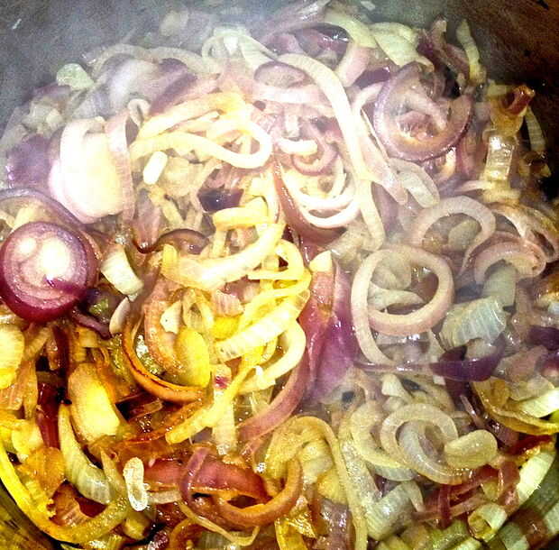 En una olla de pasta grande, situado en lo alto... Añadir el aceite, luego las cebollas y deje sofreir a fuego alto durante al menos 30 minutos... revolviendo constantemente. Cuando las cebollas son de color marrón y estén blandas, reduzca el calor a fuego lento hasta que se convierten en un fino puré... aproximadamente 1-1 1/2 horas... La mezcla parecerá un puré muy espeso con piezas enteras de cebolla y una pasta de consistencia similar.