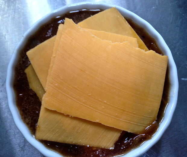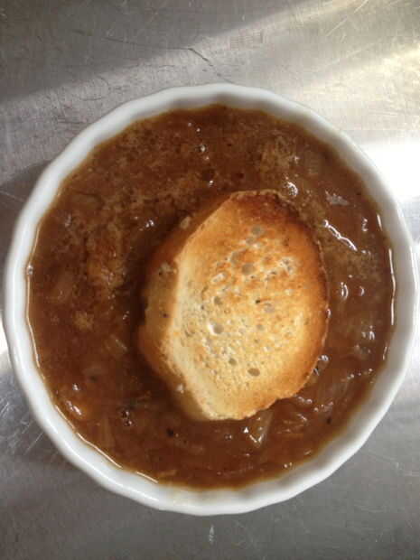 una sopa de cebolla francesa con rico sabor desde cero. No hay nada mejor que esto! Las cebollas caramelizadas le dan un sabor dulce del amiente. Esta no es la oversalted acción encontrada en restaurantes más informales. La foto es de la sopa antes d