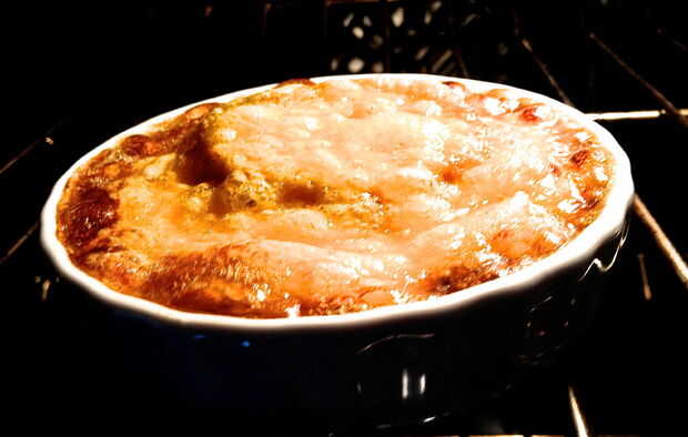 Ahora que la sopa está lista, lugar 4 moldes en una bandeja, llenar con sopa de 2/3 hasta la parte superior, luego agregue una rebanada de baguette francesa y cubra con queso. Coloque las galletas en la rejilla superior del horno para asar a la parrilla, retire en cuanto el queso empiece a derretirse...