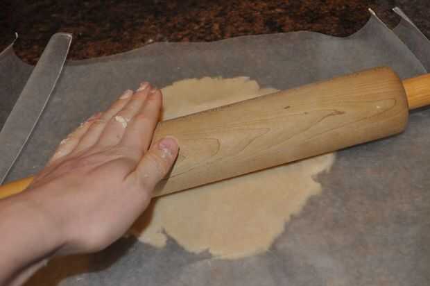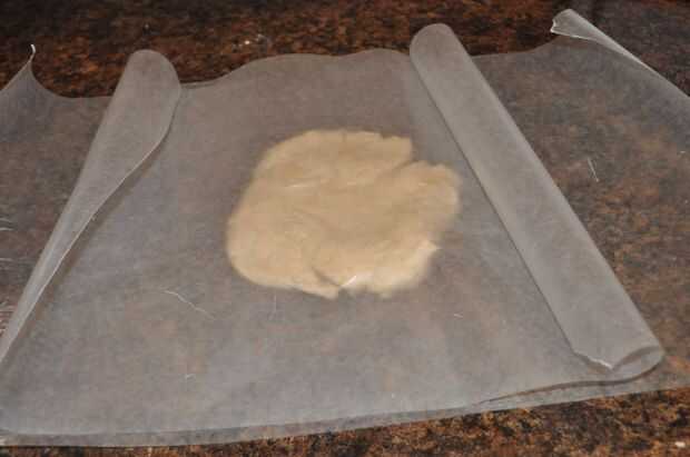 Estirar la masa con el rodillo, girando el papel de cera a la izquierda y derecha como estirar hasta para formar un círculo.