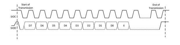 Mientras que los valores de registro administramos los pasos mencionados a continuación. Elemento básico se denomina de fase en la transferencia de datos. Podemos nombrar la estructura que utilizamos para establecer los registros como "Transmisión de escribir la fase tres". Cada fase contiene un total de nueve bits. Estos nueve bits consisten en transmisión de datos secuencial de ocho bits seguida por el noveno bit. Esto es atención no o NA poco dependiendo de si la transmisión de datos es una escritura o lectura. El número máximo de fases que pueden incluirse en una transmisión es tres. La mayoría del pedacito significativo siempre es enviado primero para cada fase. Según el diagrama de temporización SIOC y SIOD, la primera fase nos enviará será la dirección IP, la segunda será la dirección de registros y la tercera fase será el valor de los registros. (El valor de direcciones IP es 0x43 porque estamos haciendo una transacción de escritura. Si vamos a leer los valores de registro, este valor de direcciones IP es 0x42).